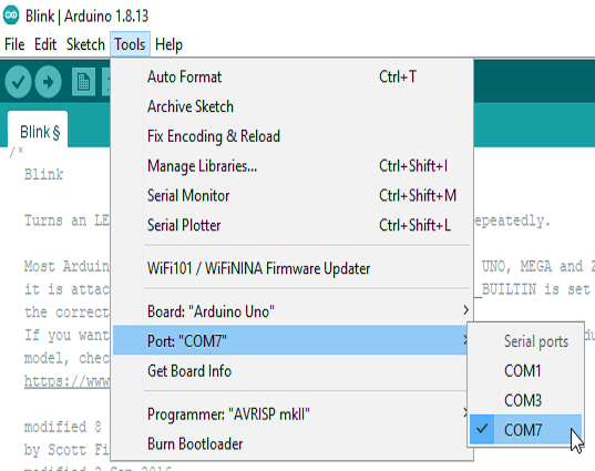 • Vào menu Tool và chọn Port. Chọn cổng tương ứng với bo mạch của bạn (phải giống với số cổng trong Device Manager).